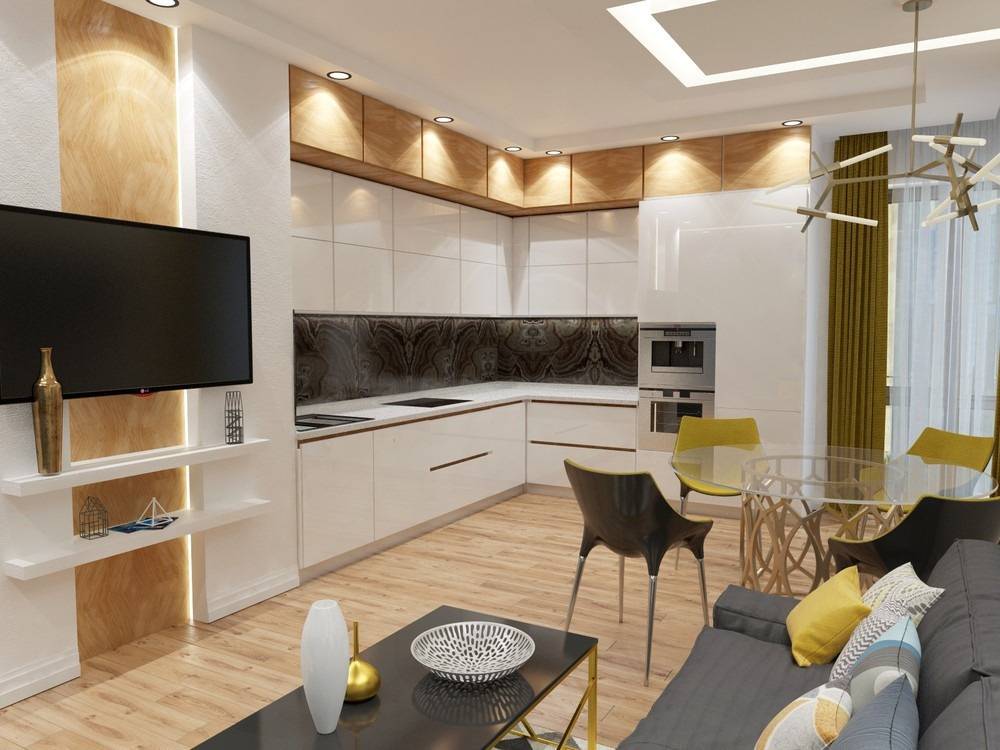 Белая гостиная с мини-кухней — хорошее начало для создания интерьера в скандинавском стиле. Композицию дополнят светлые стены и элементы под дерево на полу и мебели. Вы можете удачно дополнить такое расположение, например, горшечными растениями, создав между зонами специальную перегородку.