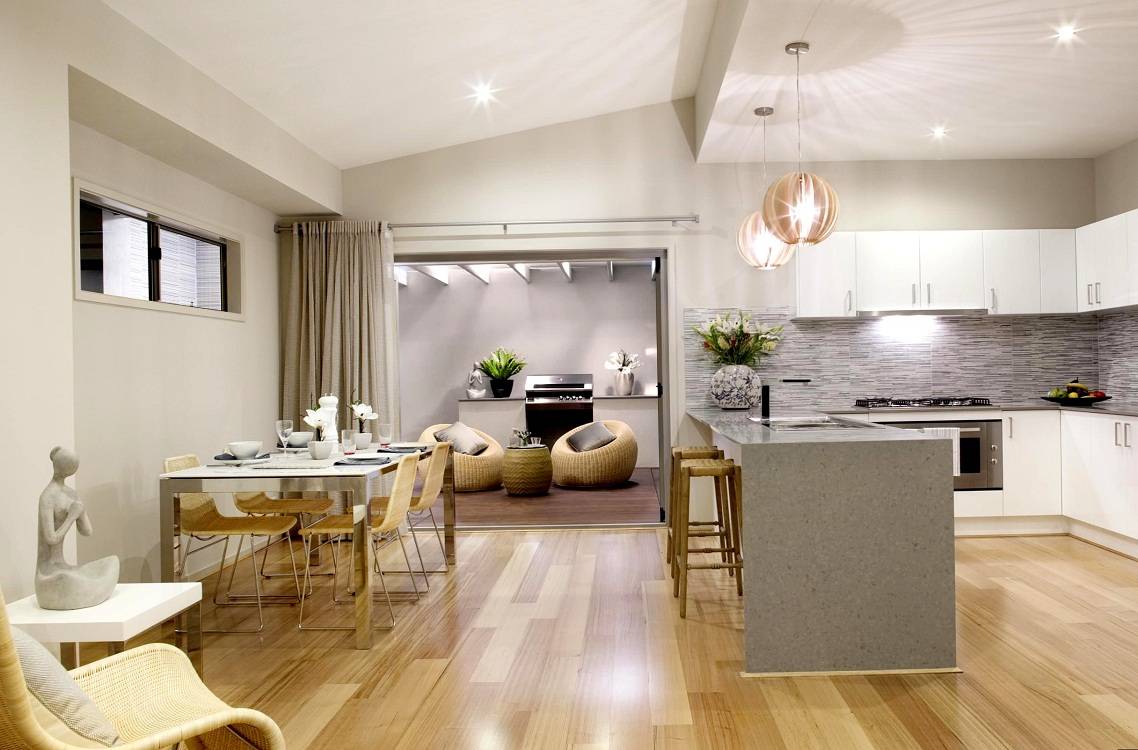 Главной задачей обустройства при такой планировке является сохранение свободного доступа к любому участку помещения. Результат во многом зависит от ширины площади. Расположение мебели и бытовой техники вдоль короткой стены освобождает пространство в центре комнаты, которое можно использовать для обеденного стола.