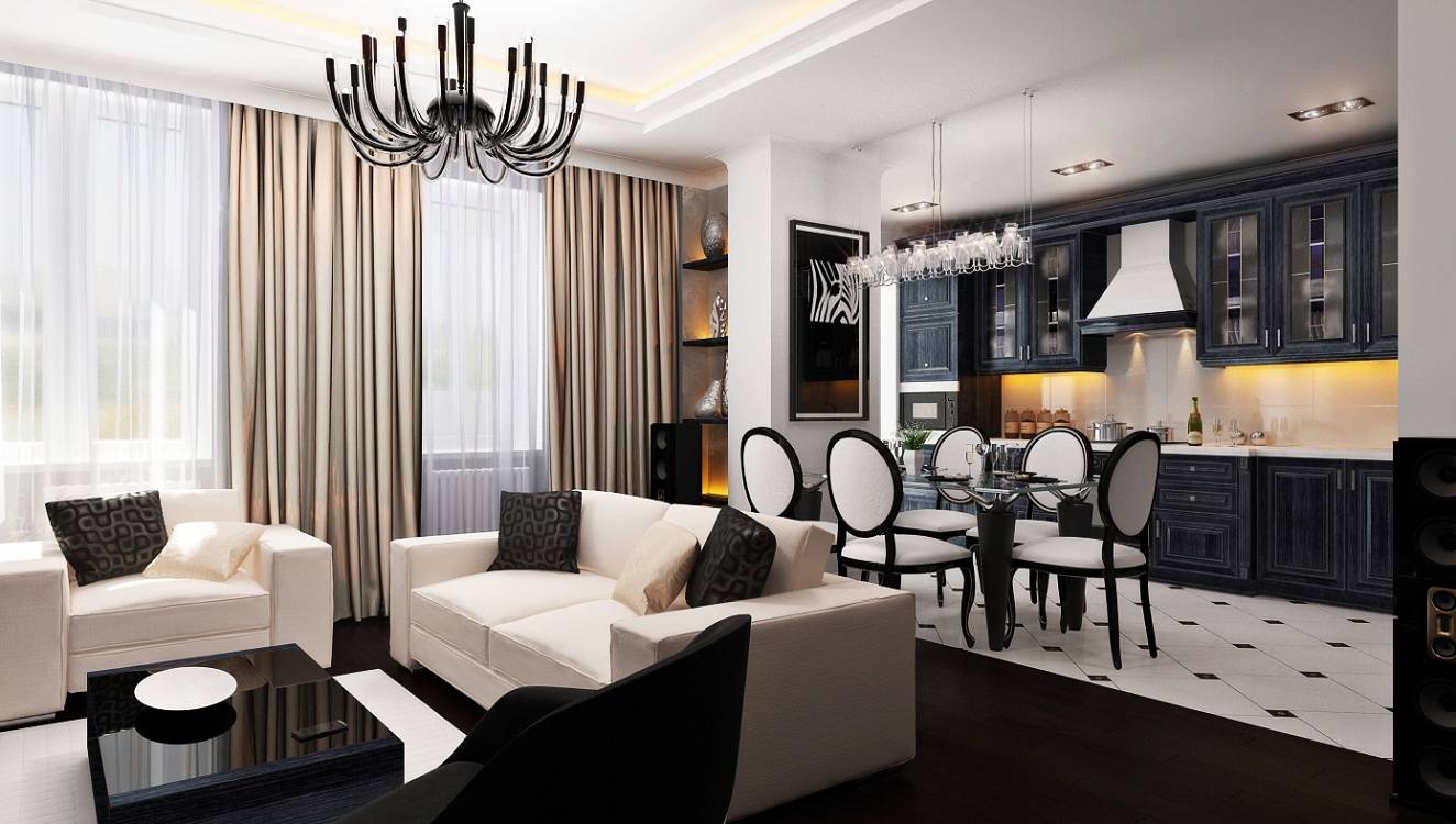 Современную гостиную с кухней в многоквартирном доме из-за ограниченного пространства можно сохранить в более светлых тонах. Здесь идеально подойдут нежные серый и белый, а характер интерьера подчеркнут только сильные аксессуары, такие как: черная фурнитура, красочные шторы или текстильные украшения.