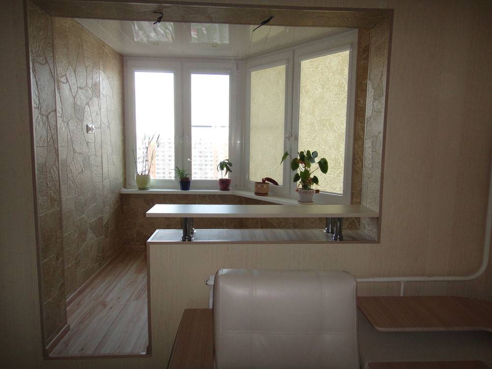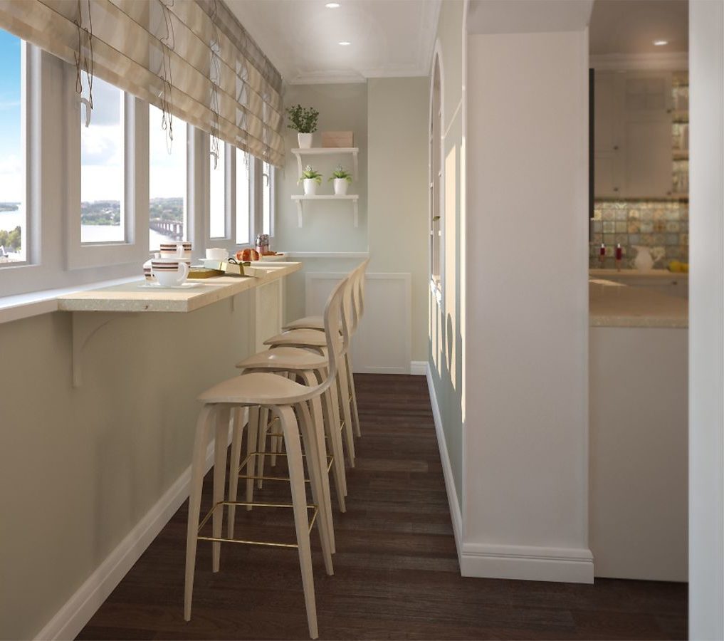 Кроме того барная стойка на границе кухни и лоджии является способом визуального разграничения помещения на зоны. Откосы окна можно использовать для оборудования ниш или ящичков.