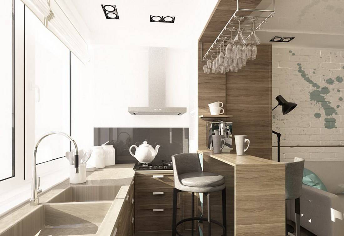 Для экономии дефицитного пространства бытовая техника встраивается в гарнитур. При этом стол можно совсем убрать, заменив его столешницей откидного типа или компактной, но функциональной барной стойкой.