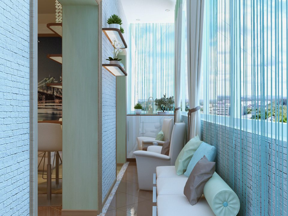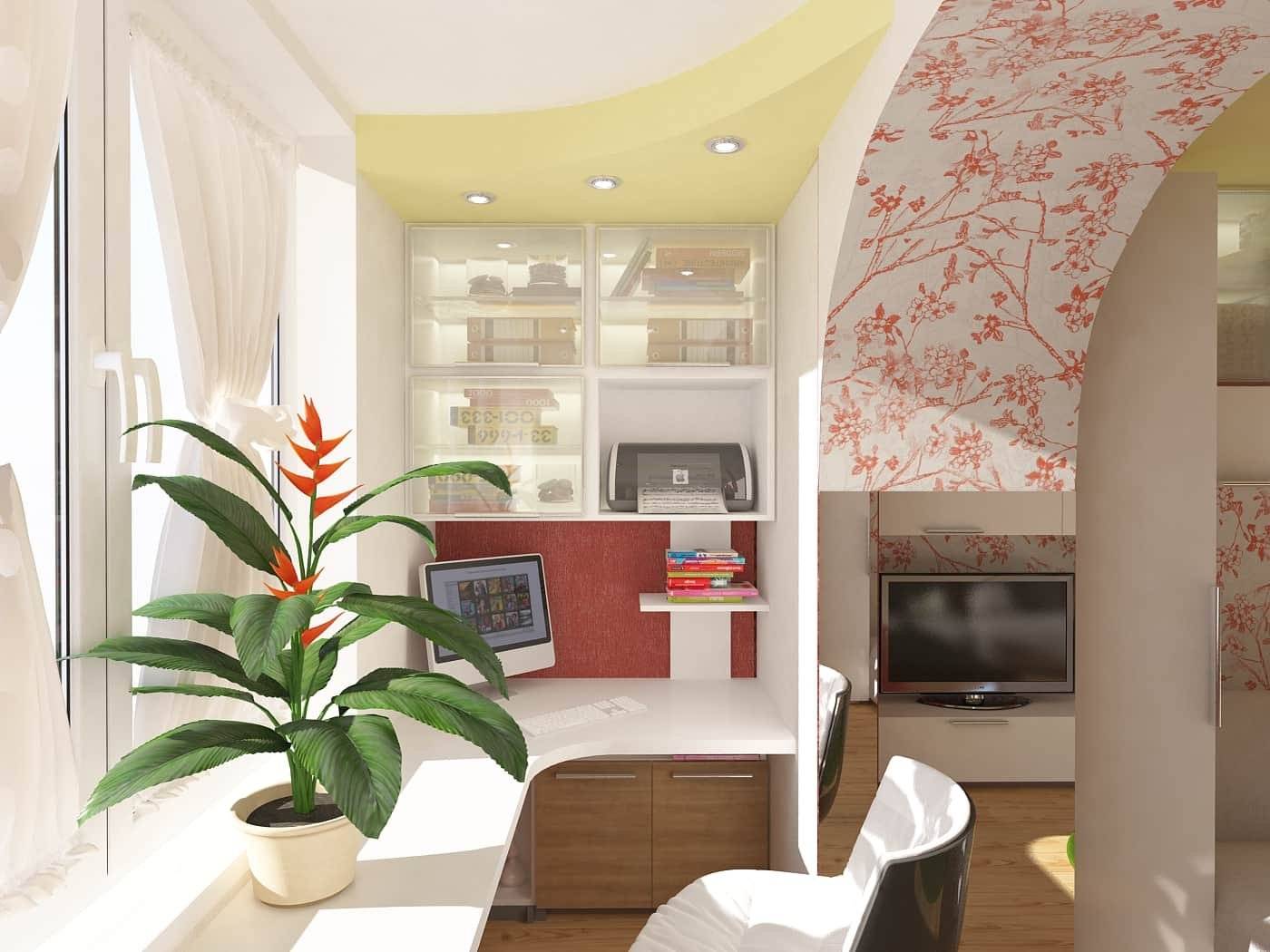 На балконе можно соорудить рабочую зону. На дополнительное пространство выводятся коммуникации, и устанавливается массивный гарнитур. Предварительно нужно получить разрешение от БТИ.