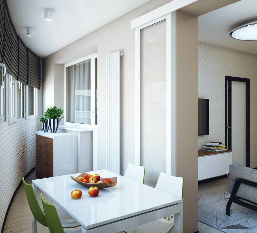 Мастера дизайнерского дела могут предложить ещё один способ, который не потребует никаких работ по демонтажу. Этот вариант подходит для большой лоджии. Именно туда перекочёвывает кухня, а на её месте устраивают столовую. Или, наоборот, на территории балкона размещают столовую, позволяющую принимать пищу и наслаждаться обзором природы за окном.