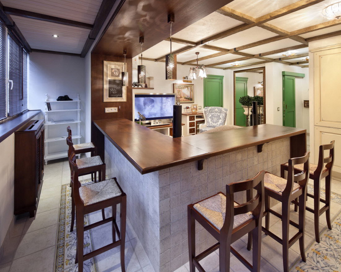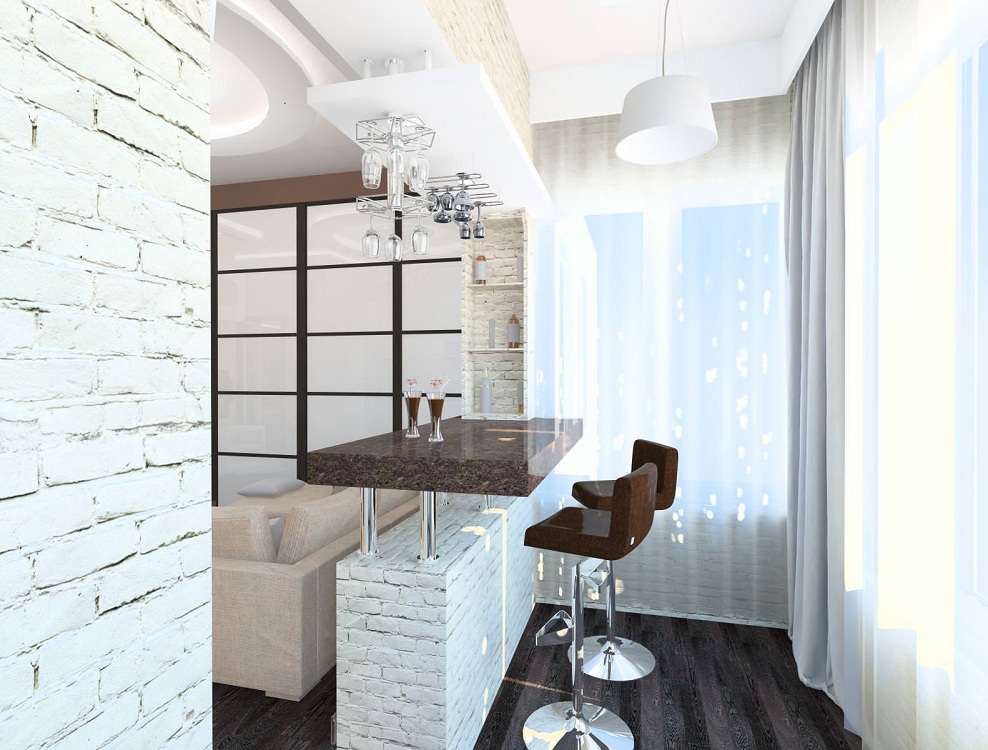С точки зрения технического исполнения это, пожалуй, наиболее простой вариант, поскольку нет необходимости полностью убирать перегородку. Можно использовать оставшуюся нижнюю часть в качестве основания для барной стойки. Теплый пол, внутреннее утепление лоджии и теплое остекление создадут необходимый комфорт и уют в любое время года. Пространство на лоджии можно дополнить винным шкафом и мини-баром с напитками. Настоящие барные стулья вдоль стойки придадут необходимый антураж, а создать по-настоящему барную атмосферу поможет тщательно продуманная система освещения. Продумайте несколько вариантов подсветки – от интимного полумрака до яркого неонового свечения, и ваш мини-бар станет универсальным местом отдыха!