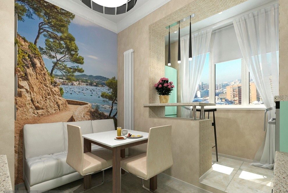 При наличии лоджии нужно выносить на нее гарнитур вместе с некоторыми бытовыми устройствами, например, холодильником и микроволновой печью. Площадь самой кухни будет использоваться в качестве столовой или зоны отдыха.