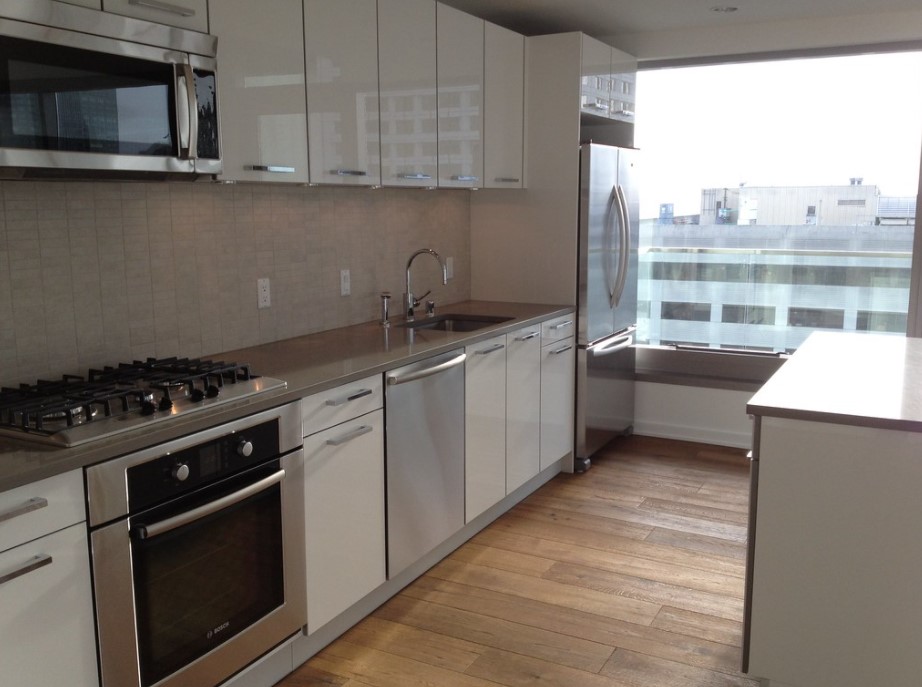 5. Соединение кухни с лоджией — порой единственный выход для тех, кому нравятся интерьеры в американском стиле. По центру комнаты, на границе расположите кухонный стол. На балконе разместите уютную столовую зону, а вдоль внутренней стены — гарнитур с необходимой техникой.