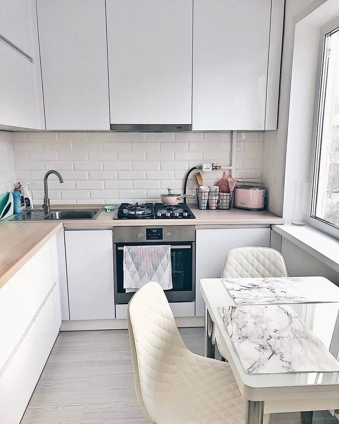 Угловая планировка сохраняет эргономичность пространства – плита, холодильник, мойка визуально объединяются в единый ансамбль треугольной формы. Это не только красиво, но и удобно во время приготовления пищи. Оставшиеся квадраты используют для установки стола и стульев.