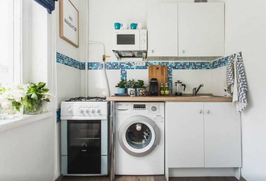 В панельных домах мойка обычно находится в углу. Если пользоваться ей так неудобно, вопрос решается путем установки тумбы 40*80 см. Ее сдвигают к середине столешницы или к окну, чтобы немного «отойти» от стены. Холодильник по возможности устанавливают в коридоре или на лоджии. Если ставить шкаф больше негде, стоит остановиться на узкой высокой модели. Действует негласное правило – или холодильник, или стиральная машина (она тоже должна быть узкой). Примеры дизайна кухонь хрущевок со стиральной машиной показывают, что вполне реально разместить на небольшом пространстве все. Главное, не брать габаритную бытовую технику, чтобы проходы остались свободными.
