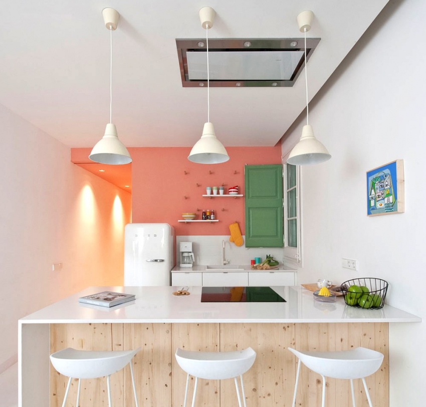 Всё-таки, барная стойка – это место для быстрого перекуса. Гостей там точно не разместишь, равно как и не пообедаешь дружно всей семьёй. И, если делать барную стойку, то в большинстве случаев придётся отказаться от полноценного стола.