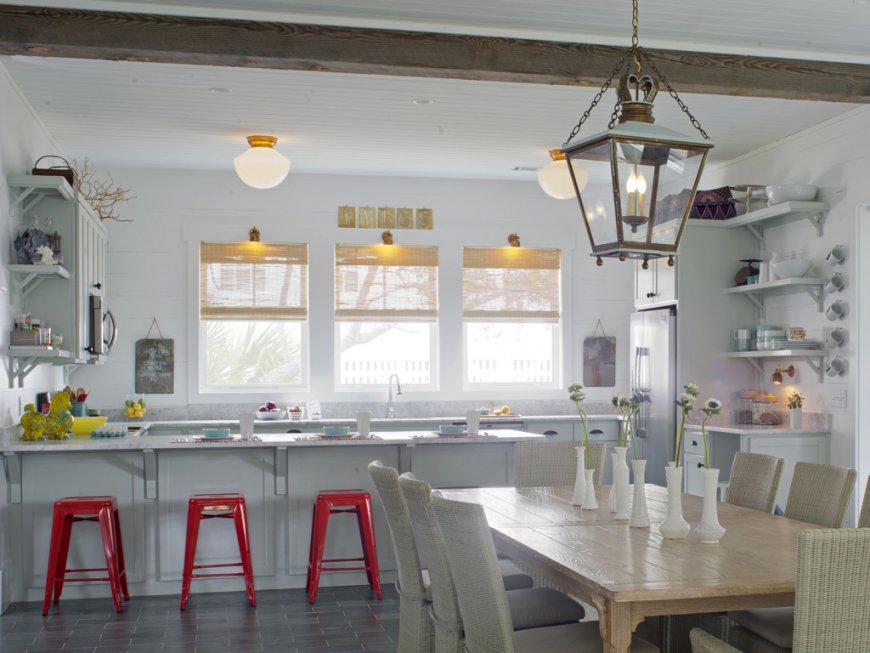 Еще один вариант, подходящий для коттеджа, — обшивка потолка деревянной вагонкой. Так создается атмосфера сельского домика на побережье.