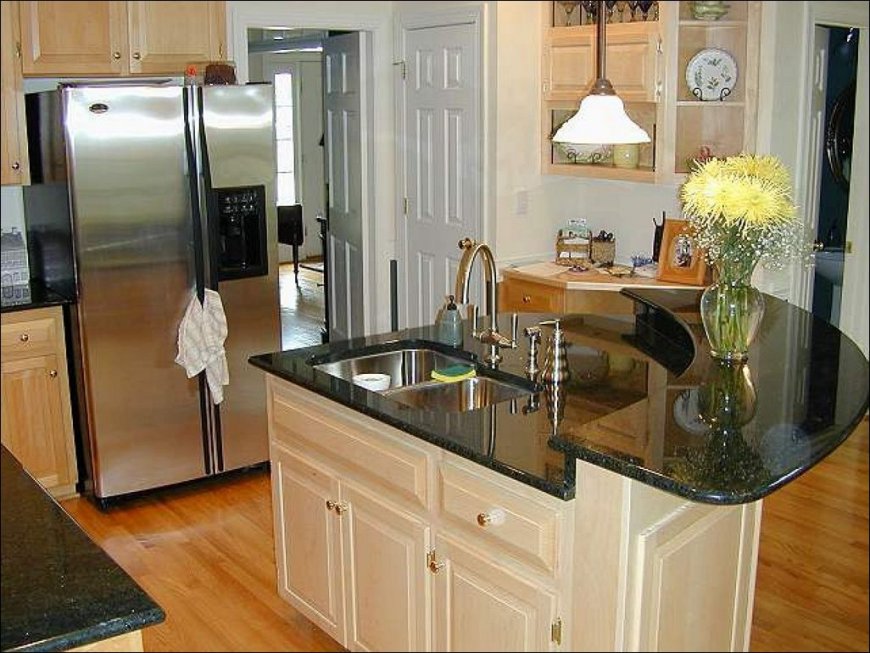 Большое количество деревянных шкафчиков и большой квадратный остров посередине помогут создать удобную рабочую зону.
