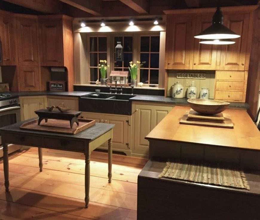 Наиболее органично будет смотреться гарнитур, выполненный из натурального дерева имеющий небольшой налет старины. Сочетать можно как закрытые шкафчики, так и открытые полочки или застекленные варианты.