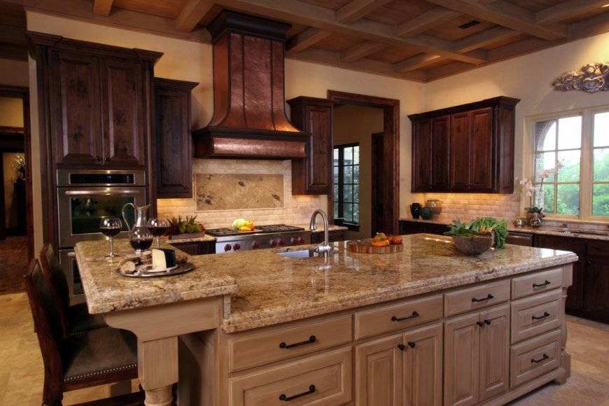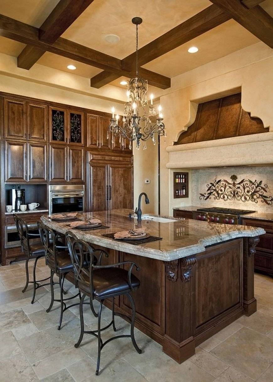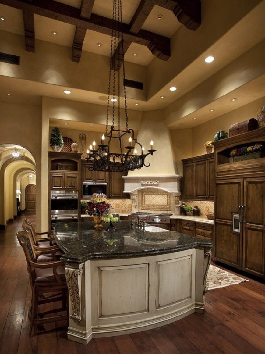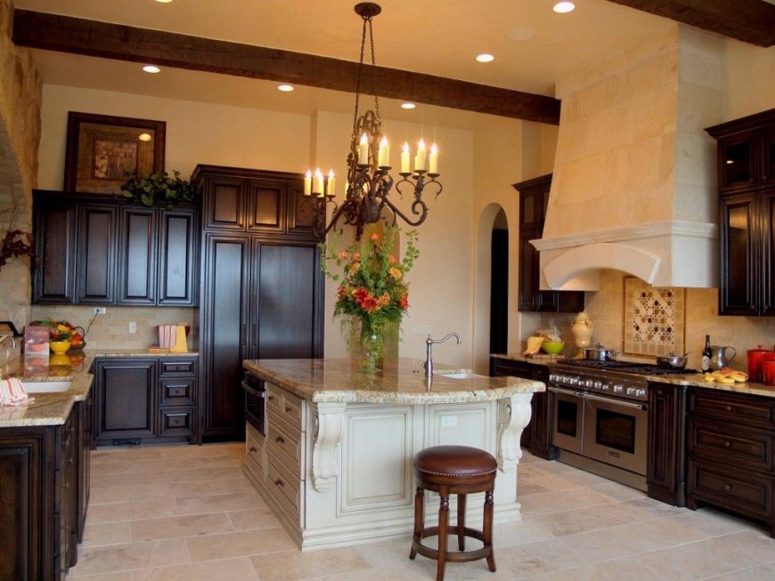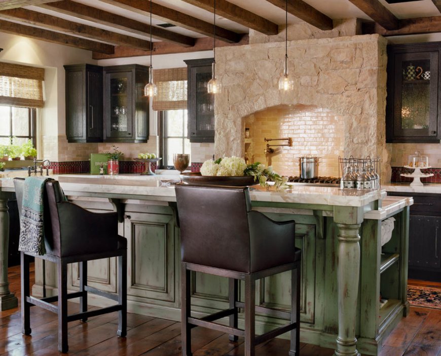На средиземноморской кухне обычно есть большая рабочая зона. Часто выделяется большой остров со столешницей из камня.