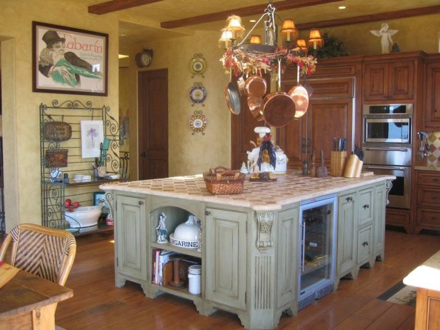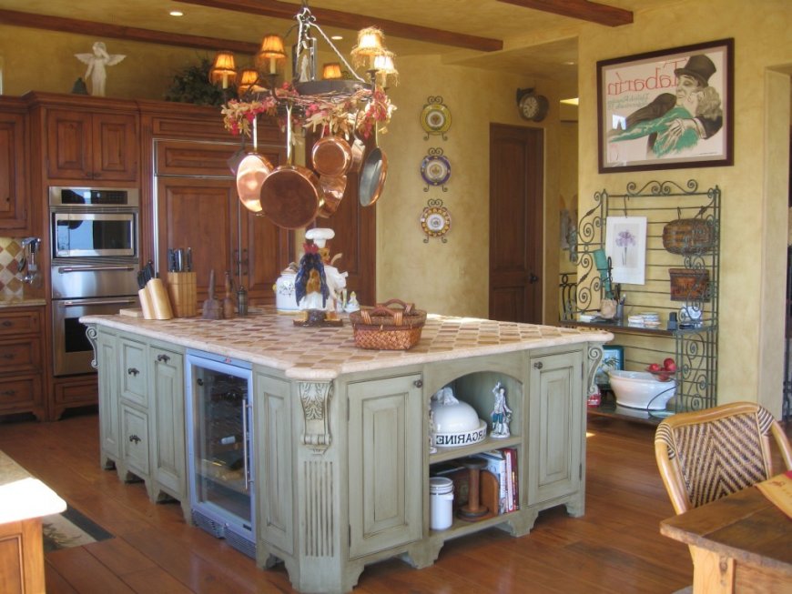 Плетеные корзинки, керамические вазочки, кованые полочки, заставленные баночками для специй, круп, сухофруктов, выполненные из фарфора и керамики, могут быть здесь в большом количестве. Керамическую посуду расставляют на открытых полках. Здесь же хранят оливковое масло, макароны в емкостях, кувшины и стаканы, кружки для напитков. А про угловую столешницу для кухни можно узнать тут.