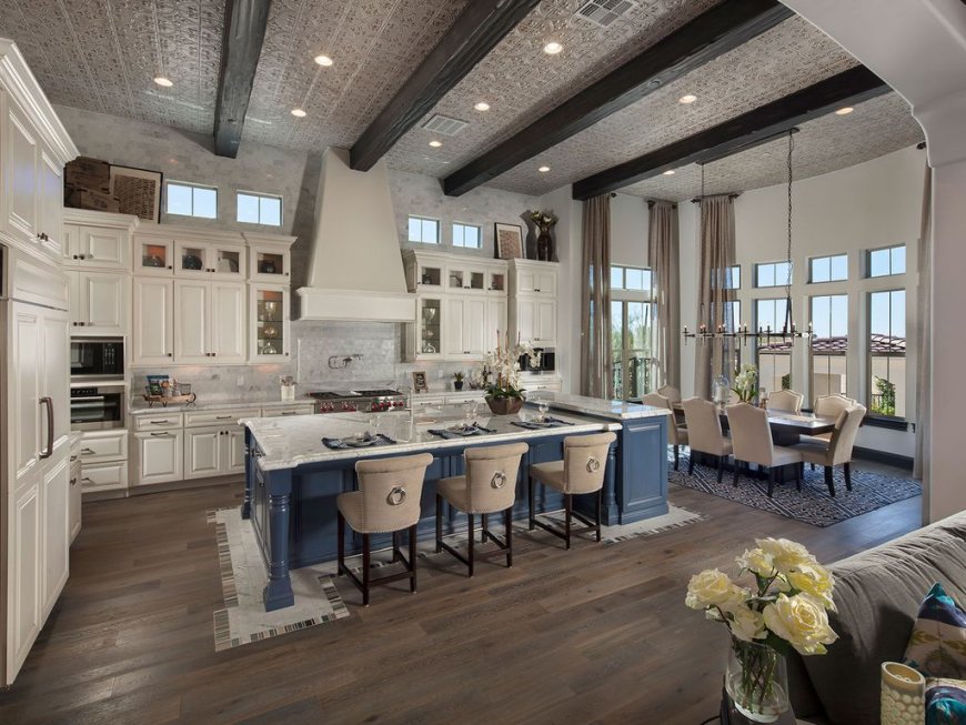 Для кухни в загородном доме можно использовать декоративные балки из дерева, но только если потолки высокие. Свободное пространство между элементами окрашивают в белый или кремовый цвета.