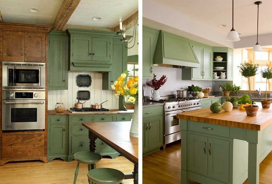 Естественный зеленый цвет легко вписывается в деревенский интерьер. При оформлении столовой можно использовать любой из его оттенков. Следует избегать искусственных тонов, не встречающихся в природе, например, неонового салатного.