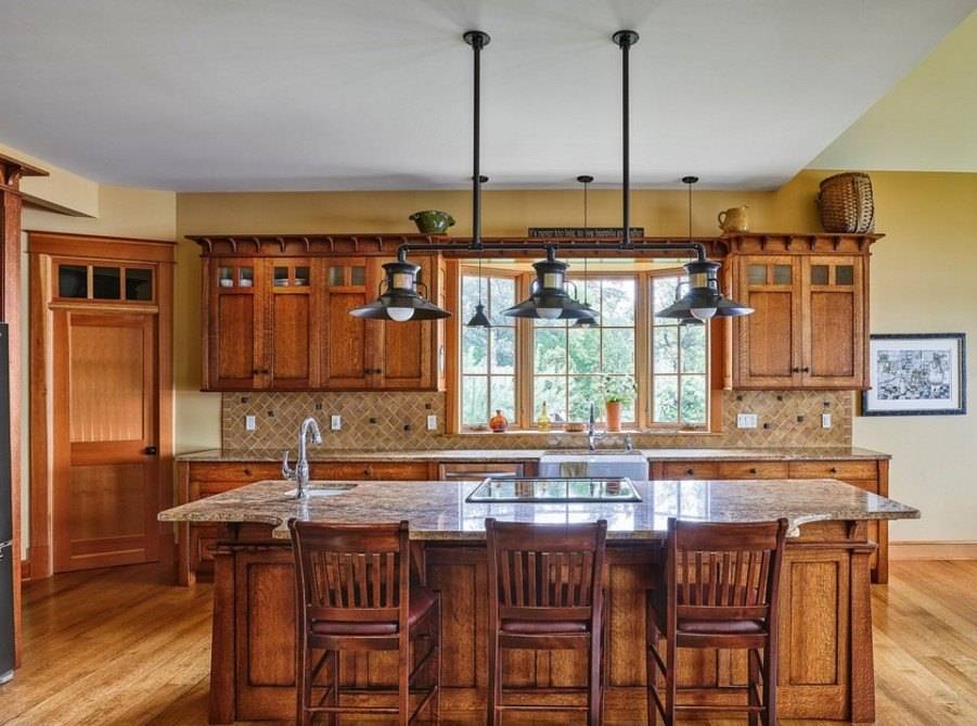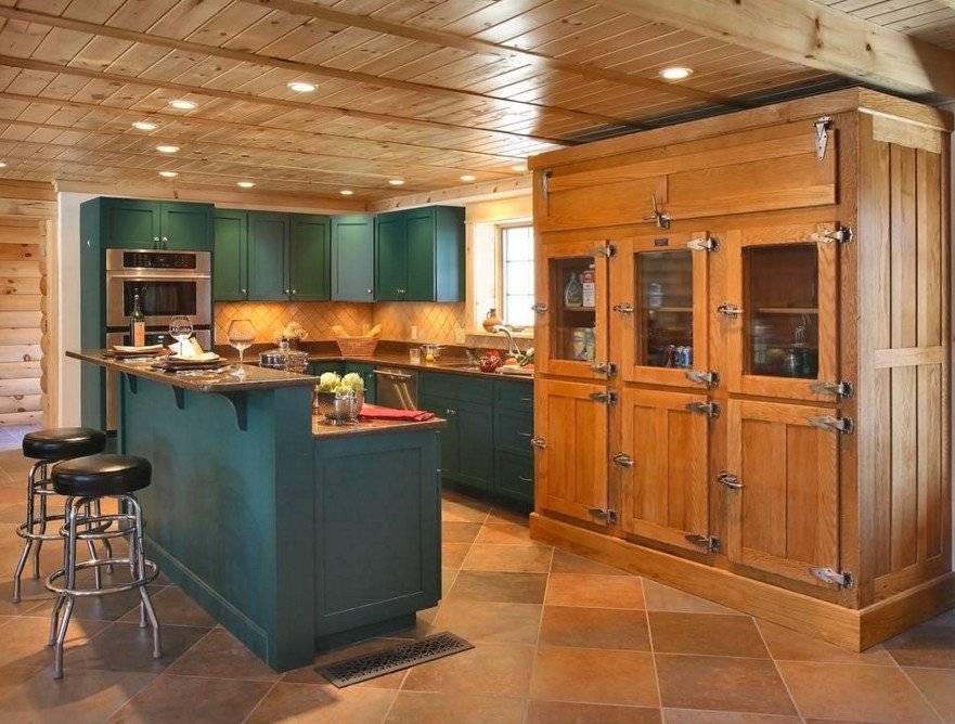 При выборе мебельного гарнитура преимущество остается на стороне натуральных материалов. Идеальным вариантом считаются такие деревья, как классический дуб, бук или более дешевый вариант – сосна. При ограниченном бюджете уместно использовать фасады из крашеного МДФ. Клееный ДСП применяют только в крайнем случае. К элементам, подчеркивающим аутентичность стиля, относят: