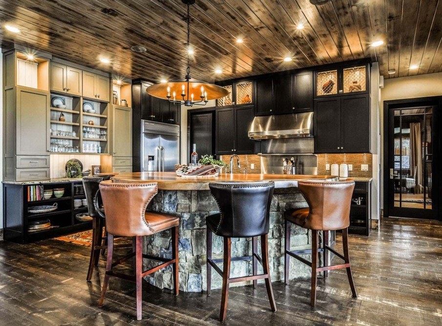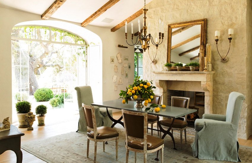 Натуральное дерево и камень, ткани и даже оттенок камина. Все должно быть максимально приближено к быту деревенской кухни.