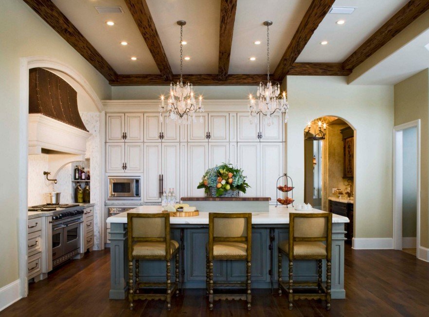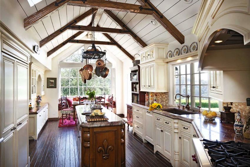 Ну, а если потолок не слишком низок, то вы можете украсить его потолочными балками. Главное, чтобы они были из натурального дерева.