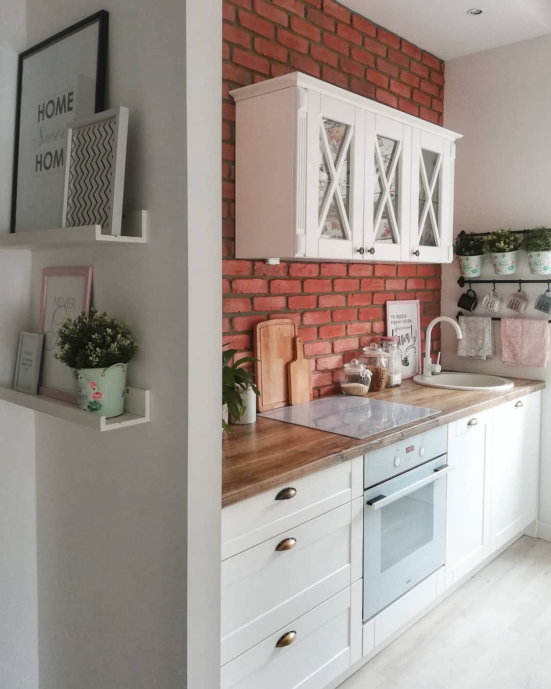 - кладка кирпича. Прекрасно смотрится, к тому же ее можно имитировать своими руками. Для этого используют смоченные в воде упаковки от яиц (их смешивают с клеем и формируют кирпичики). Когда кладка готова, стену покрывают акрилом и лаком. Можно сделать по-другому: выполнить обрамление готовыми гипсовыми плитками по типу кирпича. Они приклеиваются на гелевый состав к стене. Половину задней части можно выложить в одном цвете, например, в белом, а вторую – в красном (цвета подбираются исходя из общей стилистики кухни);