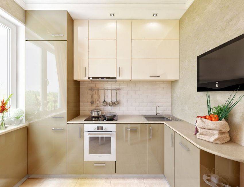 Дизайн современной, лаконичной, угловой кухни в стиле минимализм отлично подходит для небольших по размеру студий и хрущевок. Прямые однотонные фасады кухонного гарнитура без фрезеровки и рисунка могут иметь глянцевую поверхность, визуально увеличивают пространство. Отсутствие декора и стеклянных фасадов помогает избежать эффекта захламленности. Рекомендуется остановиться на светлых фасадах: белом, бежевом, салатовом, нежно-розовом.