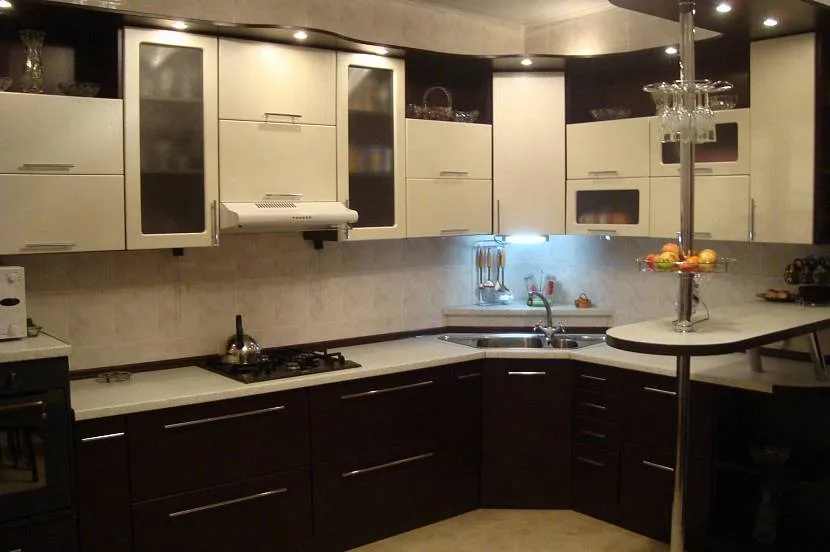 Для угловой планировки важно сохранить функциональность, вместительность и порядок. Выбор стиля также зависит от габаритов кухни и освещенности