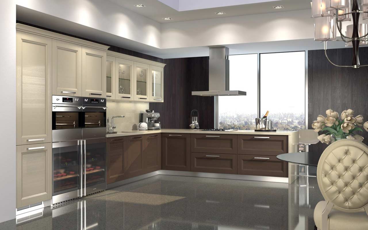 Традиционные фасады кухонного гарнитура с прямой фрезеровкой, стеклянными вставками и решетками дополняются позолоченной, серебристой или медной фурнитурой. Неоклассику можно применять как для малогабаритных кухонь, так и для просторных. Используются натуральные материалы: дерево, мрамор, керамическая плитка, гранит. Хорошо смотрится в белоснежном, коричневом, бежевом, изумрудном и винном цветах.