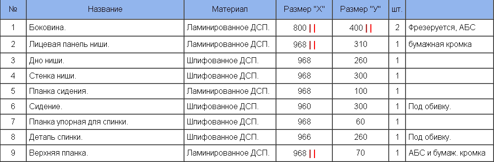 Боковины, лицевую сторону ниши, планку для сиденья и верхнюю планку для спинки делают из ламинированной ДСП, остальные из шлифованной. Боковин нужно будет 2 штуки, другие части – по 1.