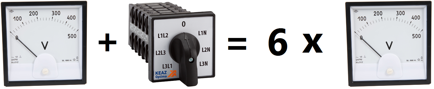 Более подробно рассмотрим последний пункт в этом списке. Так, например, для измерения фазных и межфазных величин напряжения можно применить один 7-ми позиционный кулачковый переключатель и один вольтметр. Это решение может заменить установку целых 6 отдельных вольтметров! Согласитесь, это решение удобнее в монтаже, а также экономит не только деньги, но и место в щите.