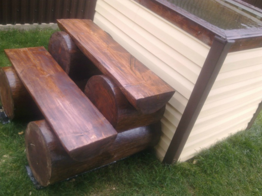 Чтобы сделать купель из еврокуба еще удобнее, соорудите ступеньки. Простейший вариант – деревянные бревна. Для сооружения опор кладем толстые бревна разной длины друг на друга, а сверху монтируем ступени, распиливая бревна пополам. Также обрабатываем их пропиткой и красим.