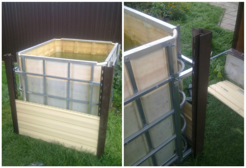 Сооружение конструкции начинаем с обрезки верхушки пластиковой емкости вместе с частью металлической обрешетки, делаем перелив по контуру. Снизу конструкции находится сливной край, который позволит нам без проблем слить воду, а при помощи шланга с насосом набрать жидкость. По углам пластиковой емкости устанавливаем металлические опоры и обшиваем ее по периметру сайдингом.