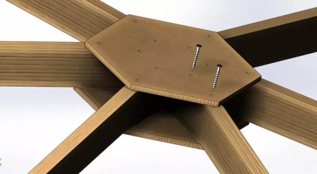 Все несущие дуги пересекаются на вершине купола и фиксируются металлическим «крабом» – коннектором Фулера. Чтобы сделать конструкцию более устойчивой, устанавливаются горизонтальные деревянные распорки.