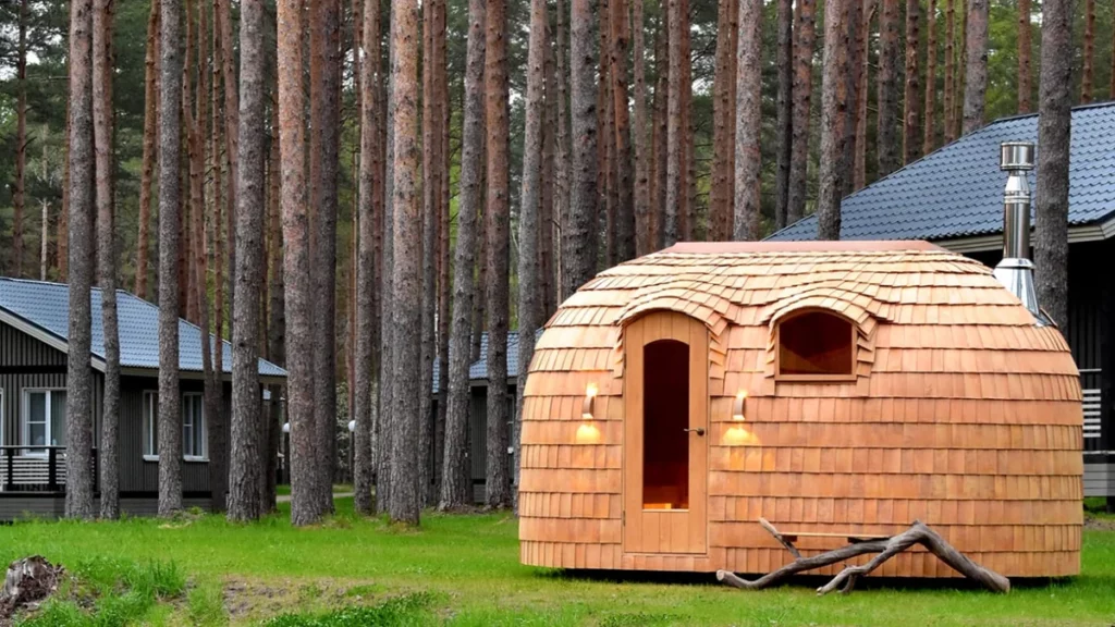 Удачным решением станет обустройство отдельной купольной конструкции для комнаты отдыха и предбанника, и второй примыкающей постройки парильного помещения с крышей в форме купола.