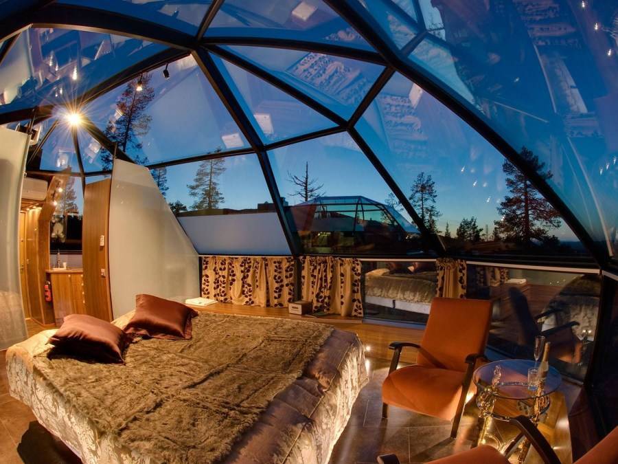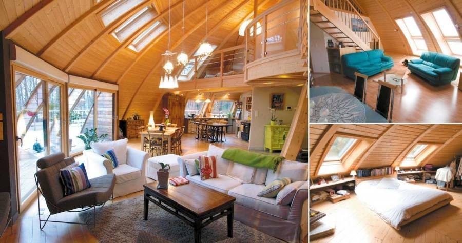 Интерьер купольного дома с тремя спальнями, одна из которых на втором этаже