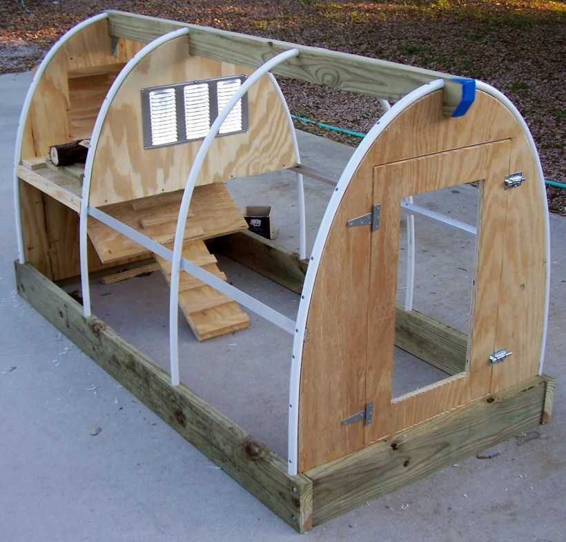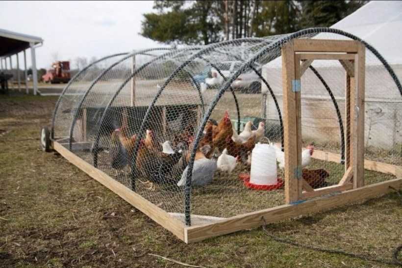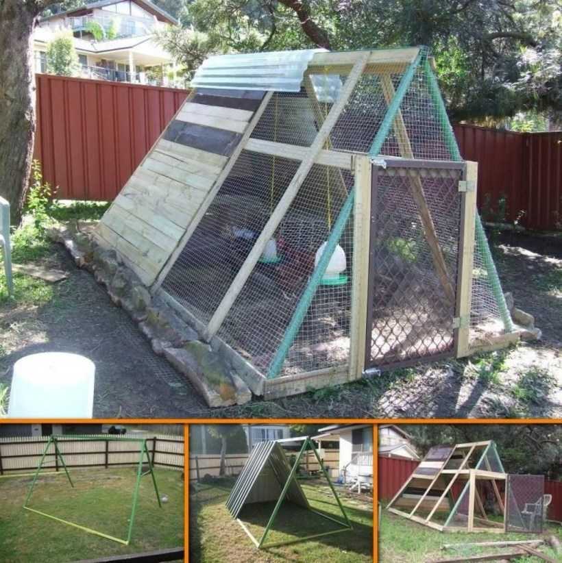 Переносной мини-птичник – это небольшой домик с местом для наседок, насестами, гнездами и выгулом. Отличаются варианты только своими габаритами и формой. Очень удобен треугольный переносной курятник на пять несушек, представленный на фото. В верхней части строения птица отдыхает и несет яйца, а нижняя часть служит выгулом. Конструкция не занимает много места на участке. Однако использовать ее можно только летом.