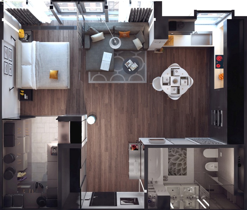 Дизайн маленькой квартиры студии сложен тем, что делает пространство несистематичным. Из-за такого нарушения, сложно поесть, отдохнуть или почитать книгу, так как одно и тоже место выступает зоной для всех развлечений.