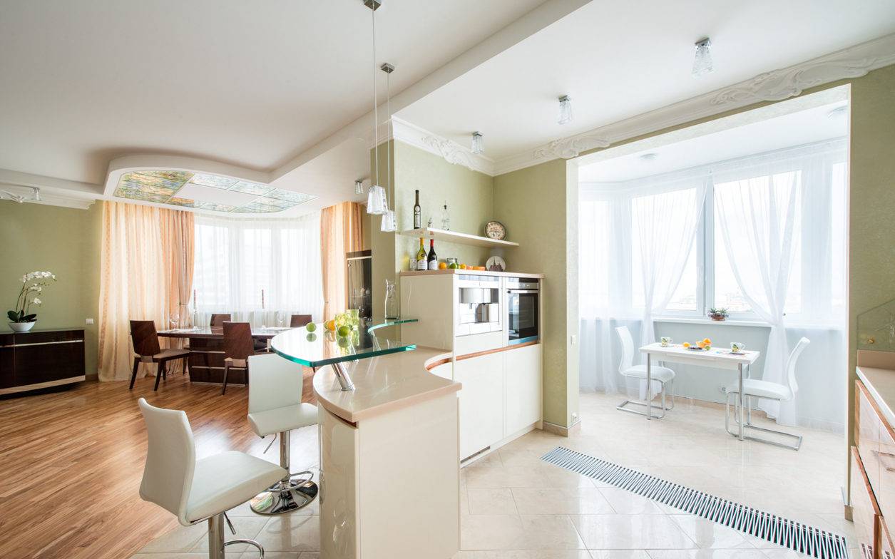 Застройщик обычно сам определяет, где будет находиться кухонный уголок, устанавливает там раковину, а под потолком скорее всего будет вытяжка. Вопрос, как отделить визуально кухню от остального пространства. Идеальный вариант — барная стойка. Она будет и компактным столом, и перегородкой. Если есть теплый балкон или лоджия, то можно объединить их с кухней, а из подоконника сделать стойку.