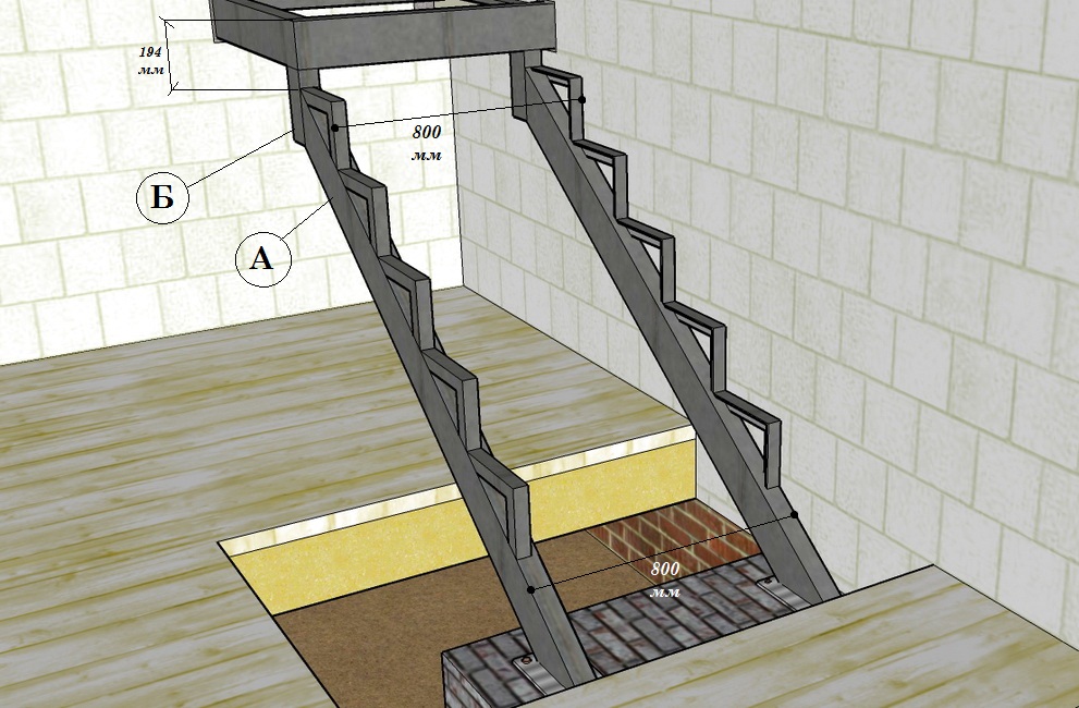 Так же нам необходимо выдержать расстояние равное 800 мм между косоурами, это расстояние от наружных торцов косоура (ширина лестничного марша). Как и при установке левого косоура, необходимо чтобы торцы (А и Б) надставки и косоура находились в одной плоскости.