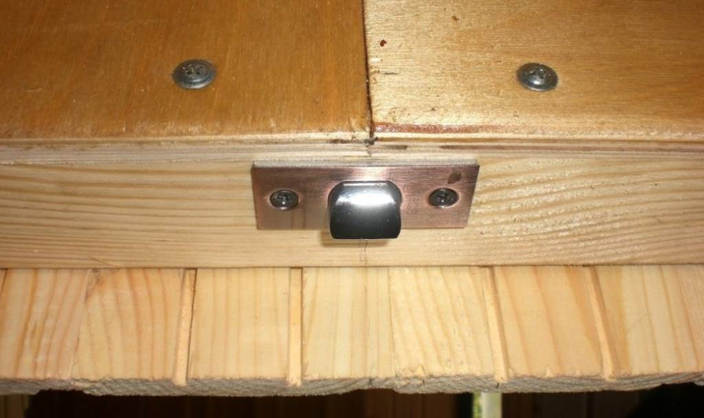 5. Чтобы люк мог закрываться, в верхнюю крышку врезают защелку. Открываться конструкция будет при помощи ручки, ее закрепляют на крышке.