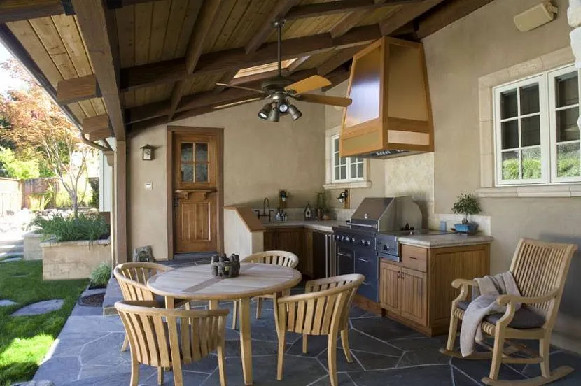 Если вы приняли решение оборудовать летнюю кухню на веранде, то запомните, она должна хорошо гармонировать со всем домом. Строительство начинают с фундамента, глубина которого должна быть соразмерной глубине основания дома.