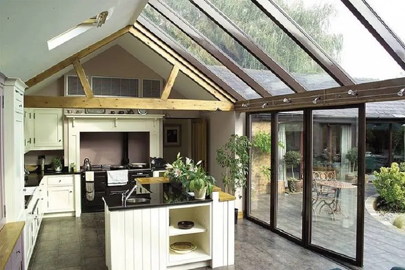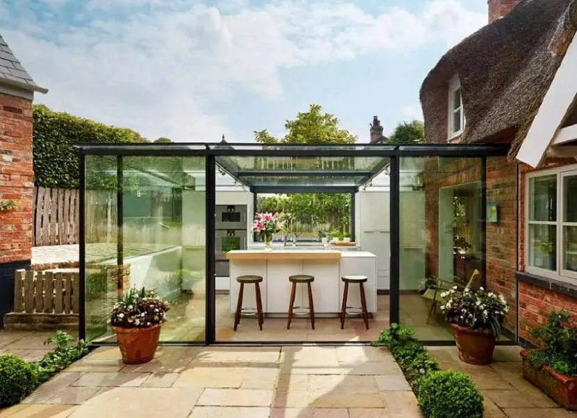 Дачная кухня из стекла, пристроенная к несущей стене здания Источник www.grill-academy.ru