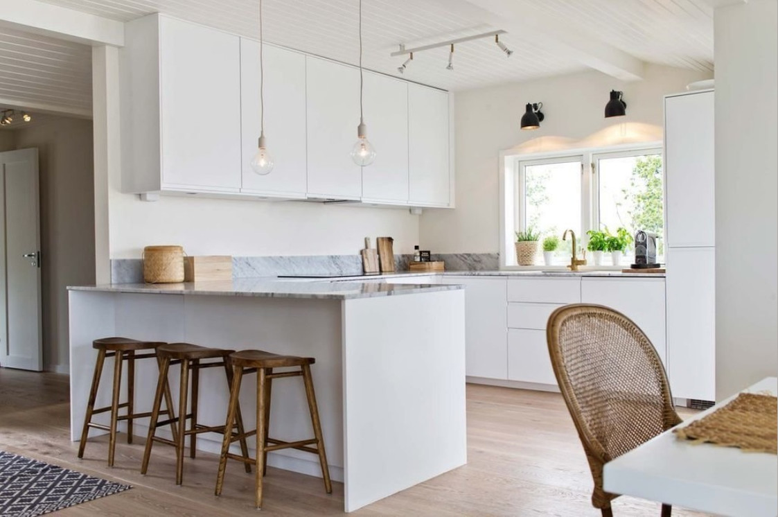 Белый цвет расширяет пространство, поэтому не бойтесь использовать его в дизайне кухни. Белоснежные фасады пачкаются не сильнее обычных, а производители давно позаботились о покрытиях, которые легко держать в чистоте даже на даче.