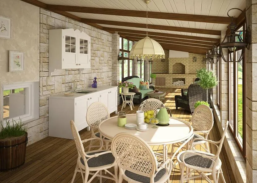 Достоинства кухни на даче, организованной на веранде, связаны и с эстетикой. В недостатках следует отметить такие: