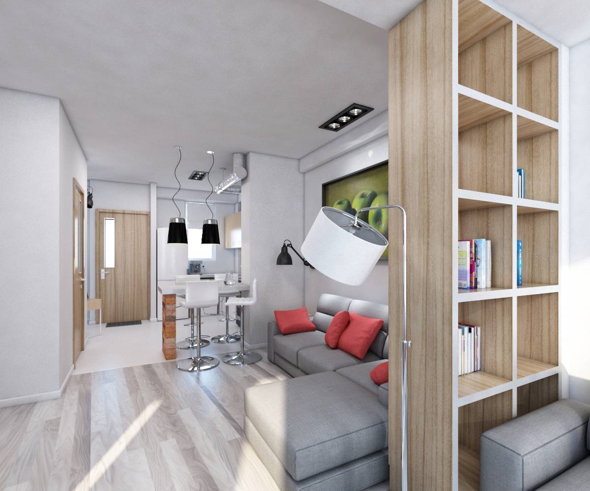 - Разделить полученную площадь на 2 зоны: новая кухня и гостиная комната.