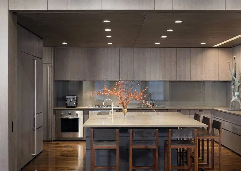 Если говорить о дизайне кухонного фартука, то в современных дизайнерских проектах кухонь можно отметить тенденцию к использованию единого отделочного материала от пола до потолка.