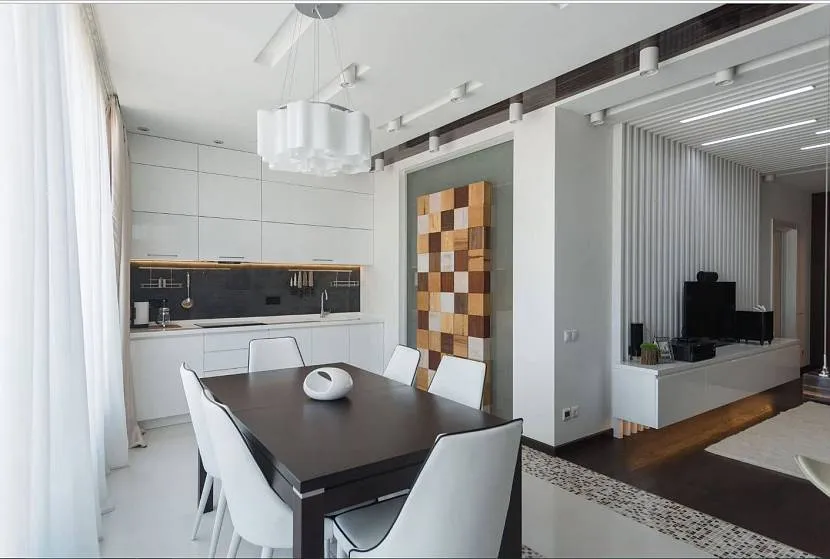 Достаточно эффектно в дизайне кухни-студии смотрятся перегородки тканевого типа. Они достаточно просто складываются и раскладываются. В любой момент вы сможете полностью перегородить вход в кухню из комнаты.