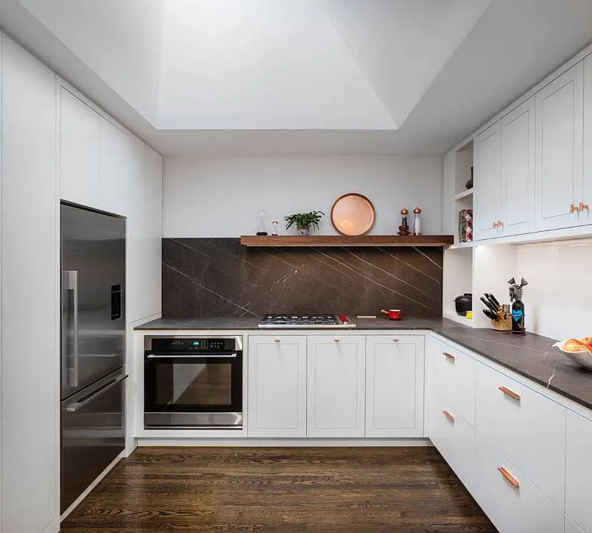 Использование жемчужного цвета для верхнего уровня шкафчиков и темных тонов для нижнего уровня позволит вам визуально увеличить высоту помещения.