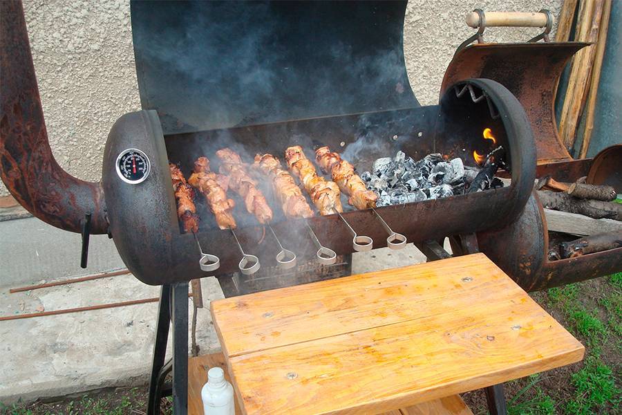 многообразие дизайна — реализовать можно разные идеи, изготовить мангал переносным или стационарным, придать дымоходу для копчения форму трубы паровоза, декорировать жаровню в винтажном стиле и др.