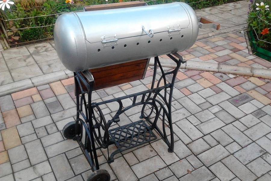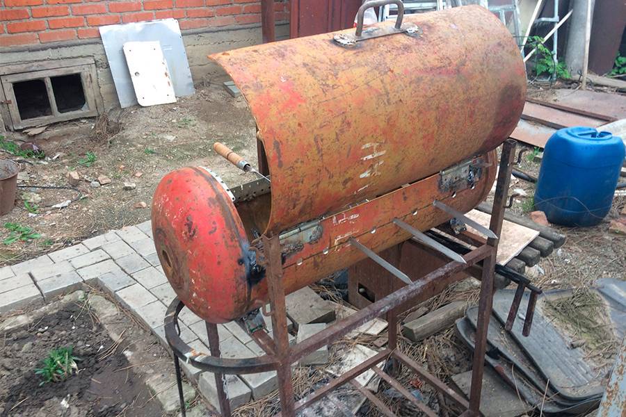 Идеальным вариантом для стационарного барбекю будет автомобильный газовый баллон на 50–80 литров. Он имеет увеличенный диаметр, поэтому разжигать дрова будет намного удобнее. Кроме того, такой сосуд обладает повышенной вместительностью. Его ширина даёт возможность задействовать всю длину стандартного шампура, а это позволит приготовить обед на большую компанию. Единственным нюансом является то, что найти ненужный автомобильный газовый бак будет непросто, а покупка нового будет нецелесообразной с финансовой стороны.