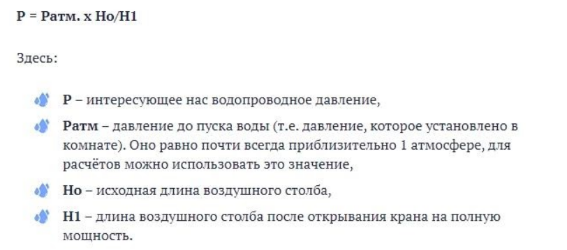 - Paтм – давление до пуска воды (т.е. давление, которое установлено в комнате). Оно равно почти всегда приблизительно 1 атмосфере, для расчётов можно использовать это значение,